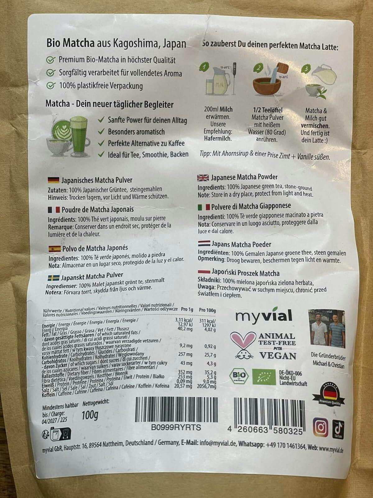 1 g Matcha enthält ca. 26,1 mg Koffein.